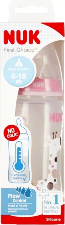 Butelka NUK First Choice+ została wyposażona we wskaźnik temperatury, który zmienia kolor w zależności od temperatury pokarmu – z niebieskiego na biały, gdy zawartość jest zbyt gorąca. Dzięki wyjątkowo miękkiemu, silikonowemu smoczkowi dostosowanemu do kształtu jamy ustnej dziecka, możliwe jest łatwe łączenie karmienia piersią i butelką. System odpowietrzania przeciwdziała kolce, a szeroki otwór ułatwia napełnianie i czyszczenie. Butelka o pojemności 300 ml przeznaczona jest dla dzieci w wieku 6-18 miesięcy. Wyprodukowano w Niemczech.