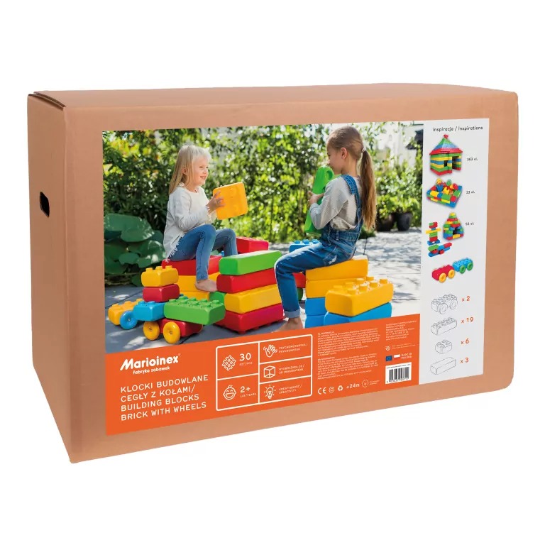 Klocki Budowlane. Cegły z kołami 30 to doskonała propozycja dla młodych fanów konstrukcji, którzy pragną realizować własne pomysły. Za ich pomocą dzieci mogą stworzyć domek, pojazd, a nawet imponującą wieżę. Zestaw składa się z 30 dużych elementów w czterech różnorodnych kształtach, które wspomagają rozwój kreatywności, koordynacji ruchowej oraz logicznego myślenia.