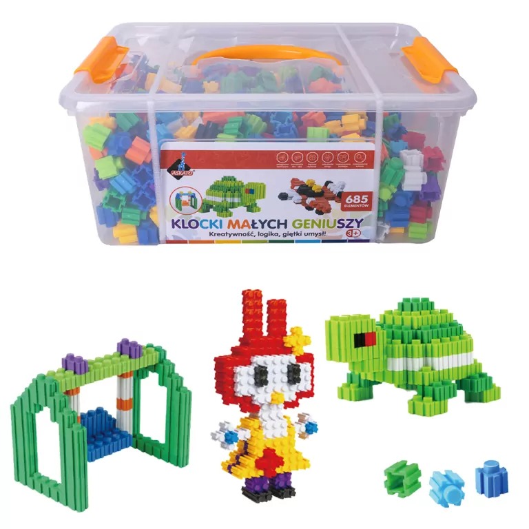 Klocki są wygodnie przechowywane w solidnym plastikowym pojemniku z uchwytem, co ułatwia utrzymanie porządku po skończonej zabawie i zapewnia łatwość przenoszenia. Takie rozwiązanie jest dodatkowym plusem dla opiekunów dbających o porządek i wygodną organizację przestrzeni. Dzięki temu klocki można łatwo zabrać w podróż lub przechowywać w dziecięcym pokoju bez obawy o bałagan.