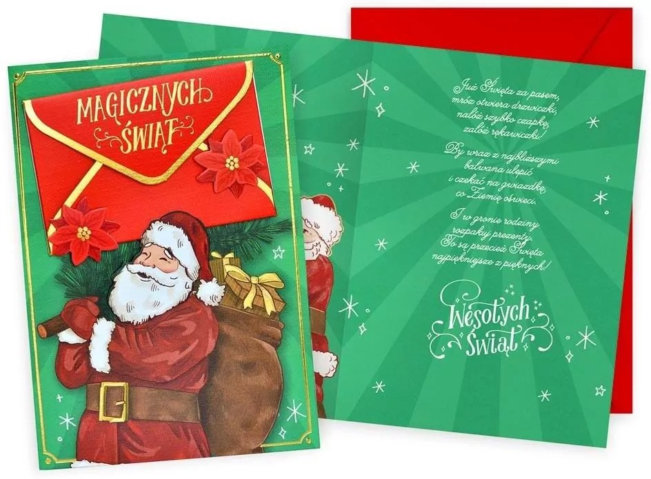 W obecnych, coraz bardziej cyfrowych czasach, wiele osób idąc nieco naprzekór, wraca do tradycji i życzeń w “analogowej” postaci. Jeśli bowiem nie można złożyć ich osobiście, może warto postawić na… świąteczne kartki. Dziś niestety odchodzi się od życzeń w takiej postaci, ale ci, którzy jednak by się na to zdecydowali, nadal mają szerokie pole możliwości. Zamiast wysyłać sms, e-mail czy pisać życzenia na Messengerze, można kupić jedną z pięknych kartek, które są puste w środku, a więc gotowe na uzupełnienie ich spersonalizowanymi życzeniami. Można polecić tutaj m.in. takie kartki jak Karnet KW BN Bałwan, Karnet. Boże Narodzenie. Fernando albo Karnet Swarovski kwadrat: Święta Sanie. Jeśli ktoś szuka jednak kartek uzupełnionych życzeniami, także ma w czym wybierać. Świetnym przykładem jest piękny Karnet Dk-1212 Boże Narodzenie z wizerunkiem Św. Mikołaja niosącego wór z prezentami. W nieco podobnym tonie jest Karnet B6 Boże Narodzenie, zdobiony brokatem lub metaliczną folią. Na uwagę zasługuje też kartka Karnet B6 Boże Narodzenie z piękną, kolorową choinką ze śniegiem w tle.