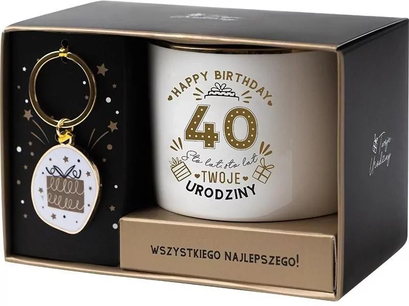 Elegancki zestaw na czterdzieste urodziny w biało-złotej kolorystyce to świetny pomysł na podarunek dla kobiety. Jego wyjątkowość tkwi nie tylko w efektownym wyglądzie, ale również w praktycznych walorach. W jego skład wchodzi doskonałej jakości kubek ceramiczny wraz ze stylowym metalowym brelokiem.